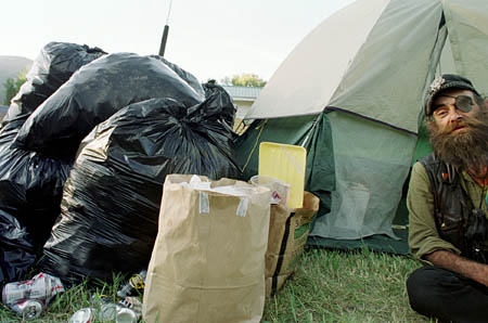 Testy Fest One-eyed Jack leans against the temporary residence he calls "home" for the weekend during the Testicle Festival. " I'm the wild card in the bunch. I came here to look for gold. I searched and searched, but they ain't got no gold now so I might as well party," Jack said. Each year Jack collects all the cans that are abandoned at the festival so that he has enough money to buy another weekend pass to return the following year. " Is it next year, yet?" Jack asks as he cradles another open beer in his lap. |
