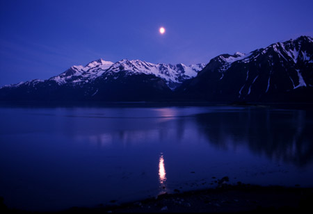 During the middle of summer, a full moon rises to a dusky midnight blue sky in the Chilkat Valley near Haines, Alaska.